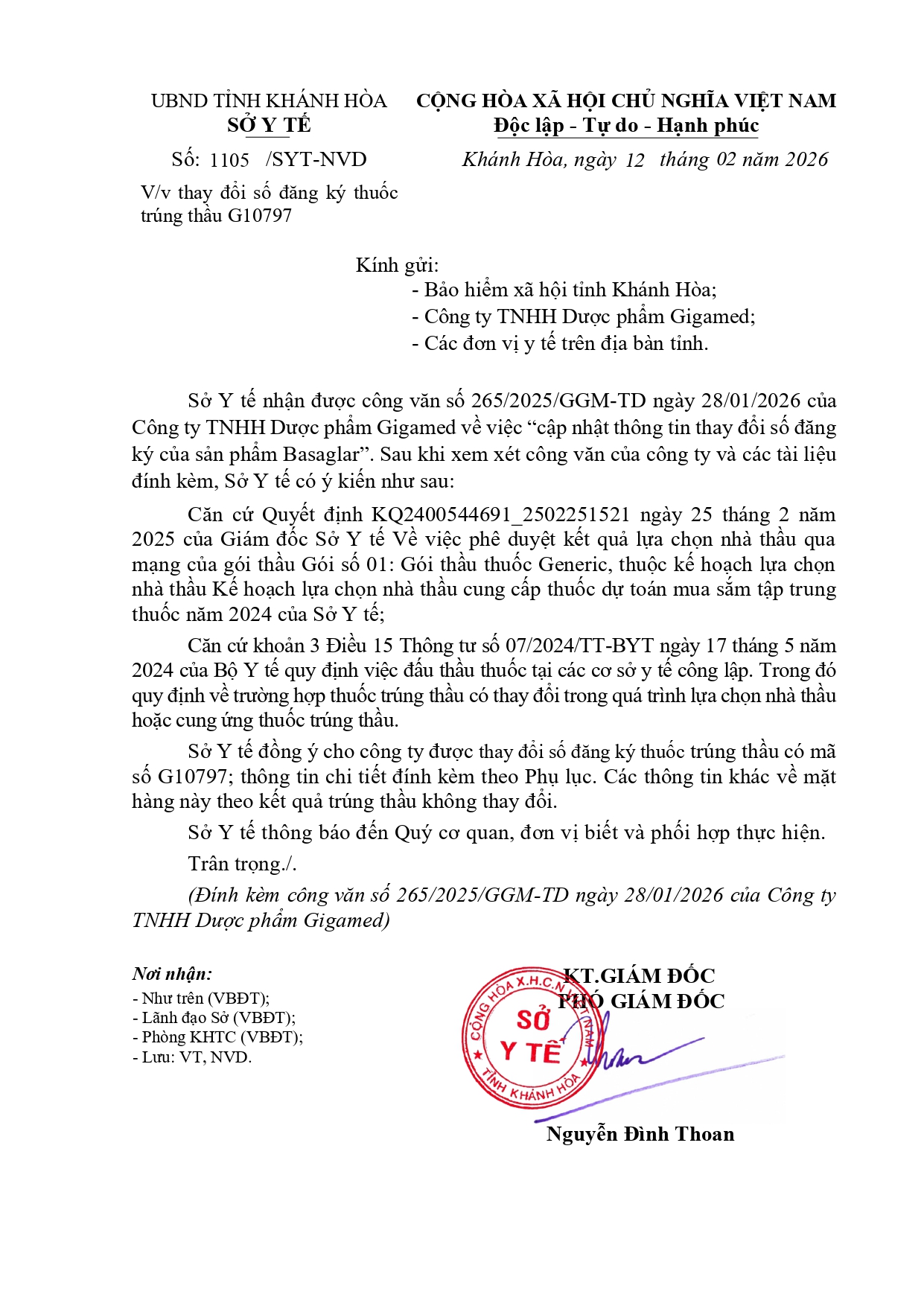 Quyết định Về việc điều chỉnh một số nội dung của Quyết định số 754/QĐ-SYT ngày 15/10/2025 của Sở Y tế về việc phê duyệt kết quả lựa chọn nhà thầu qua mạng gói số 1: Gói thầu thuốc Generic thuộc kế hoạch lựa chọn nhà thầu cung cấp thuốc: Mua sắm tập trung thuốc cấp địa phương tỉnh Khánh Hòa năm 2025-2027 (lần 2)