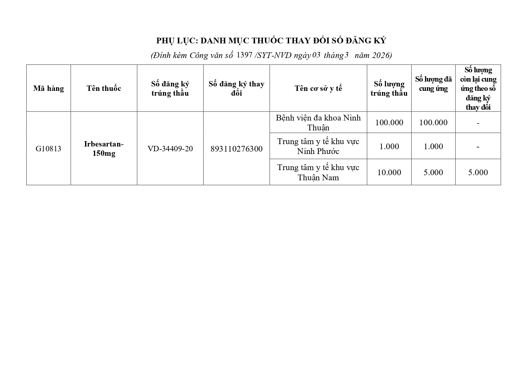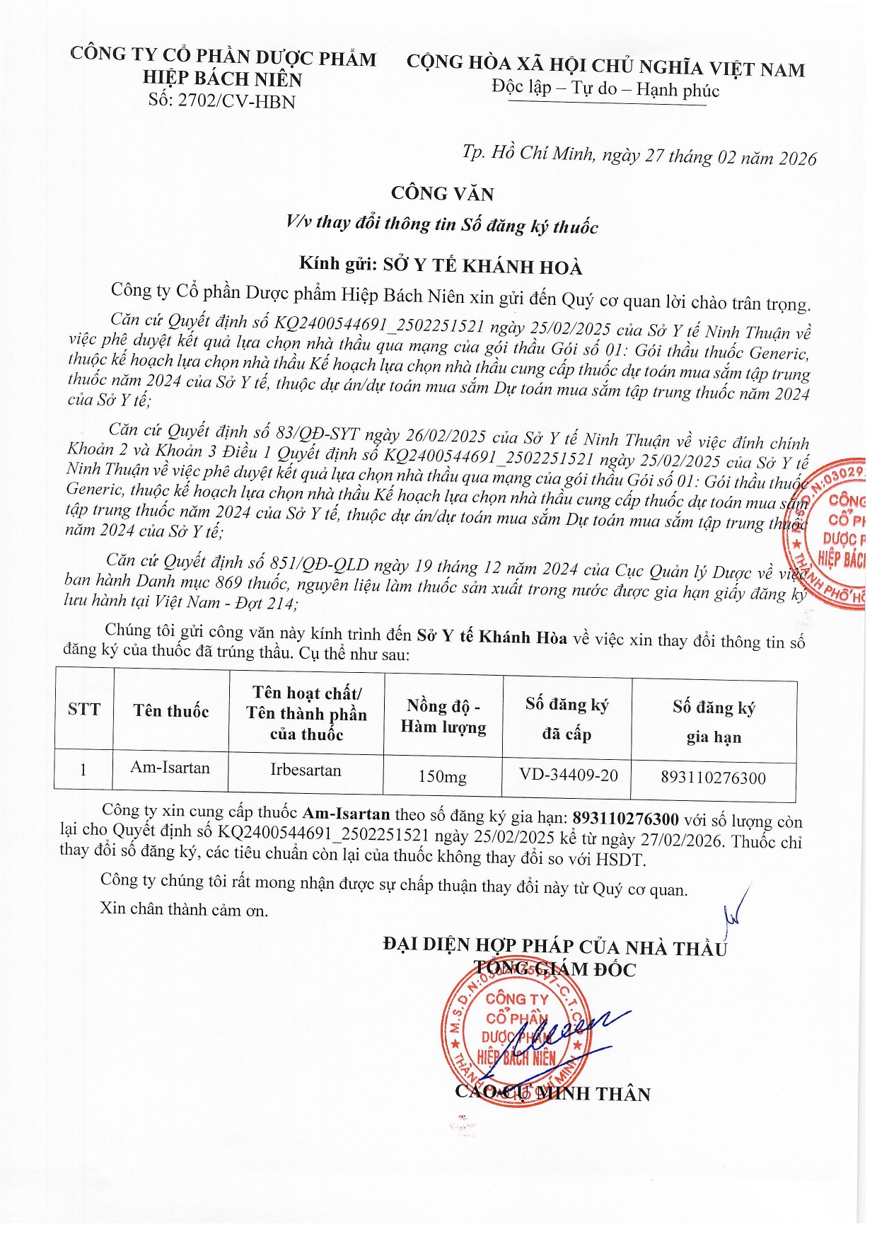 V/v thay đổi số đăng ký thuốc trúng thầu mã hàng G10813.