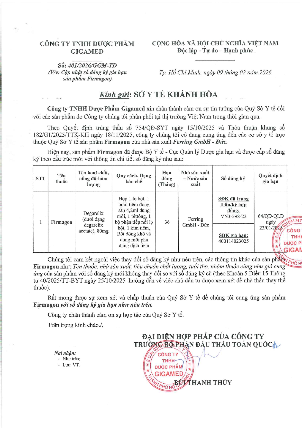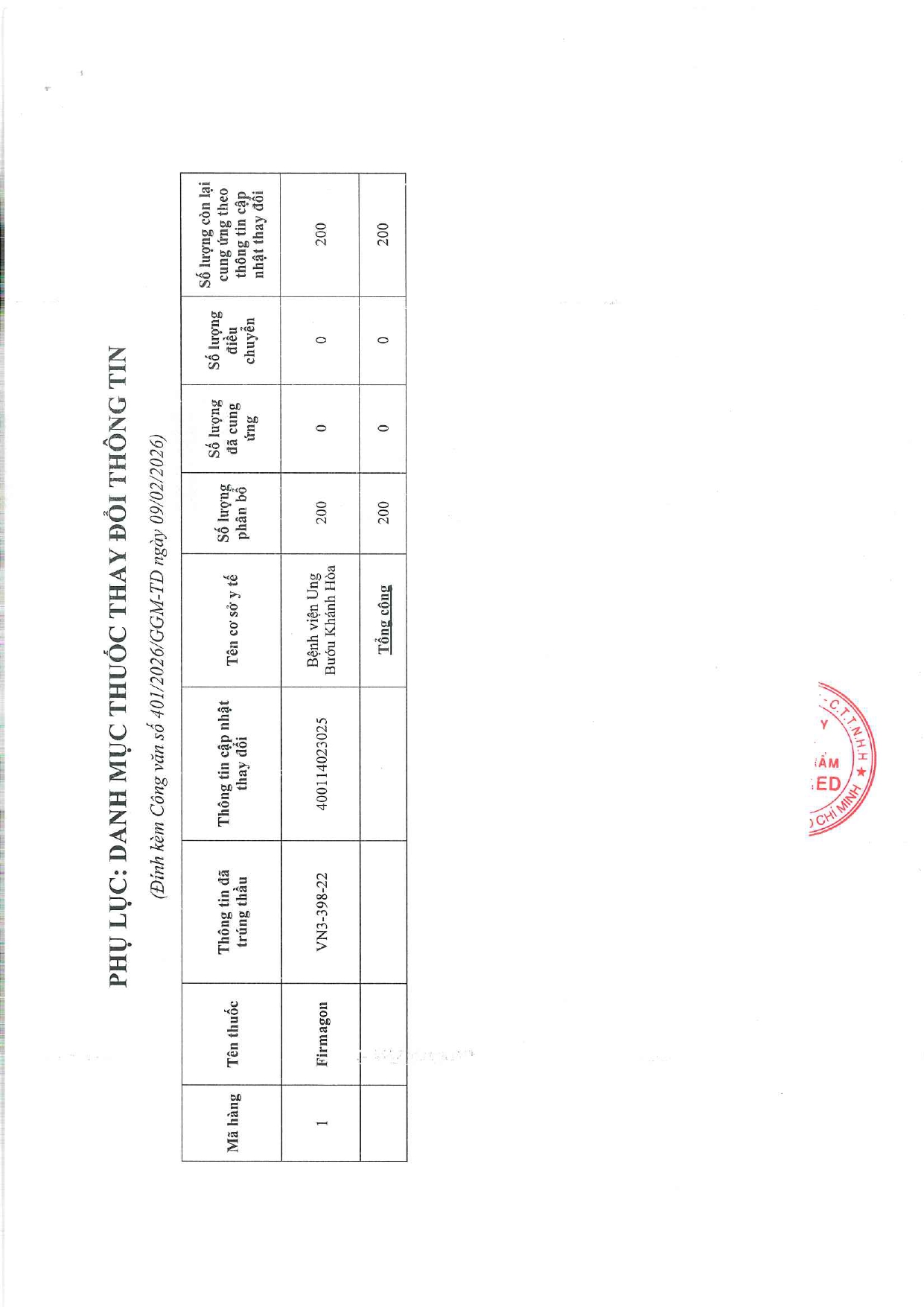 V/v thay đổi số đăng ký của mặt hàng trúng thầu