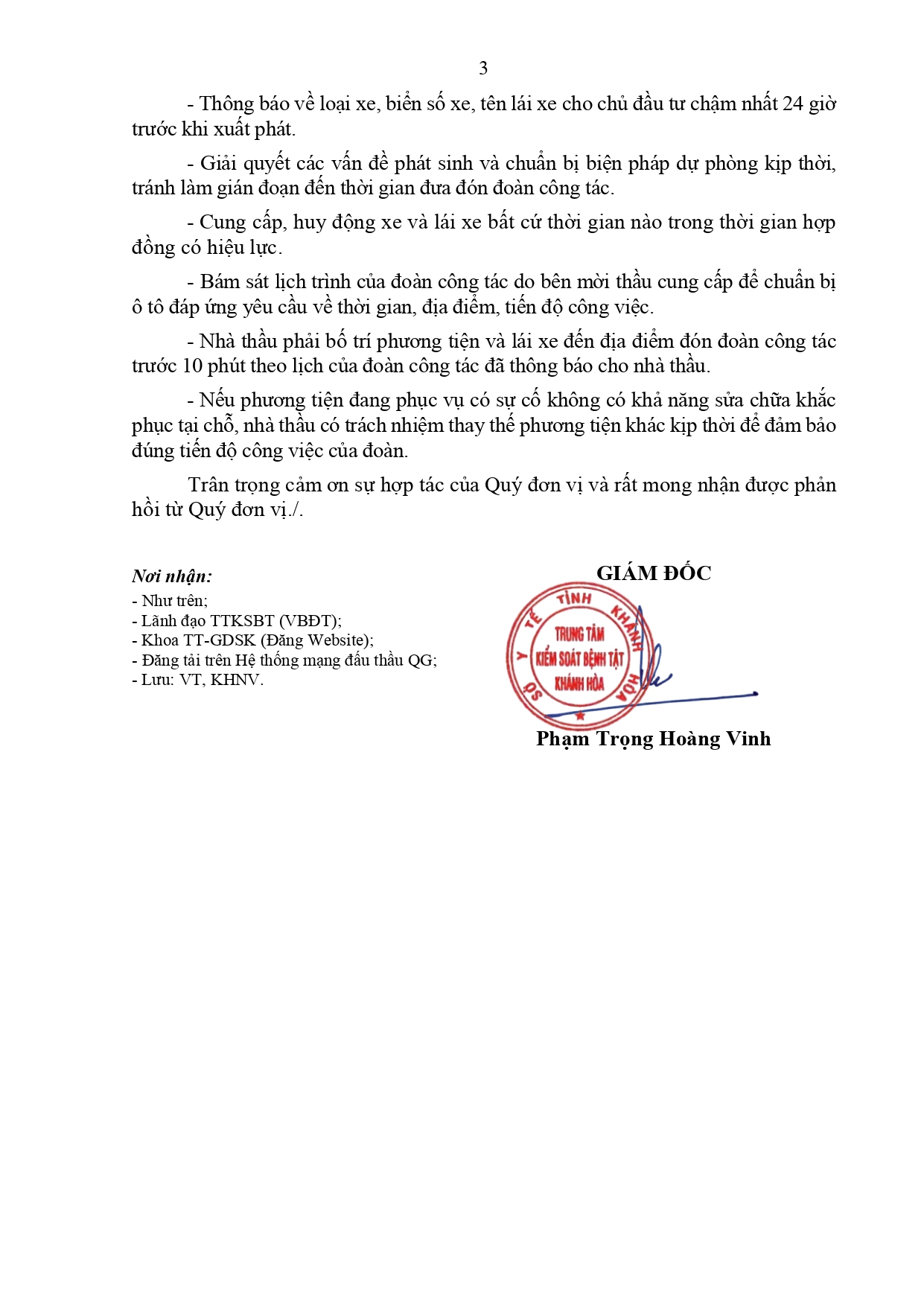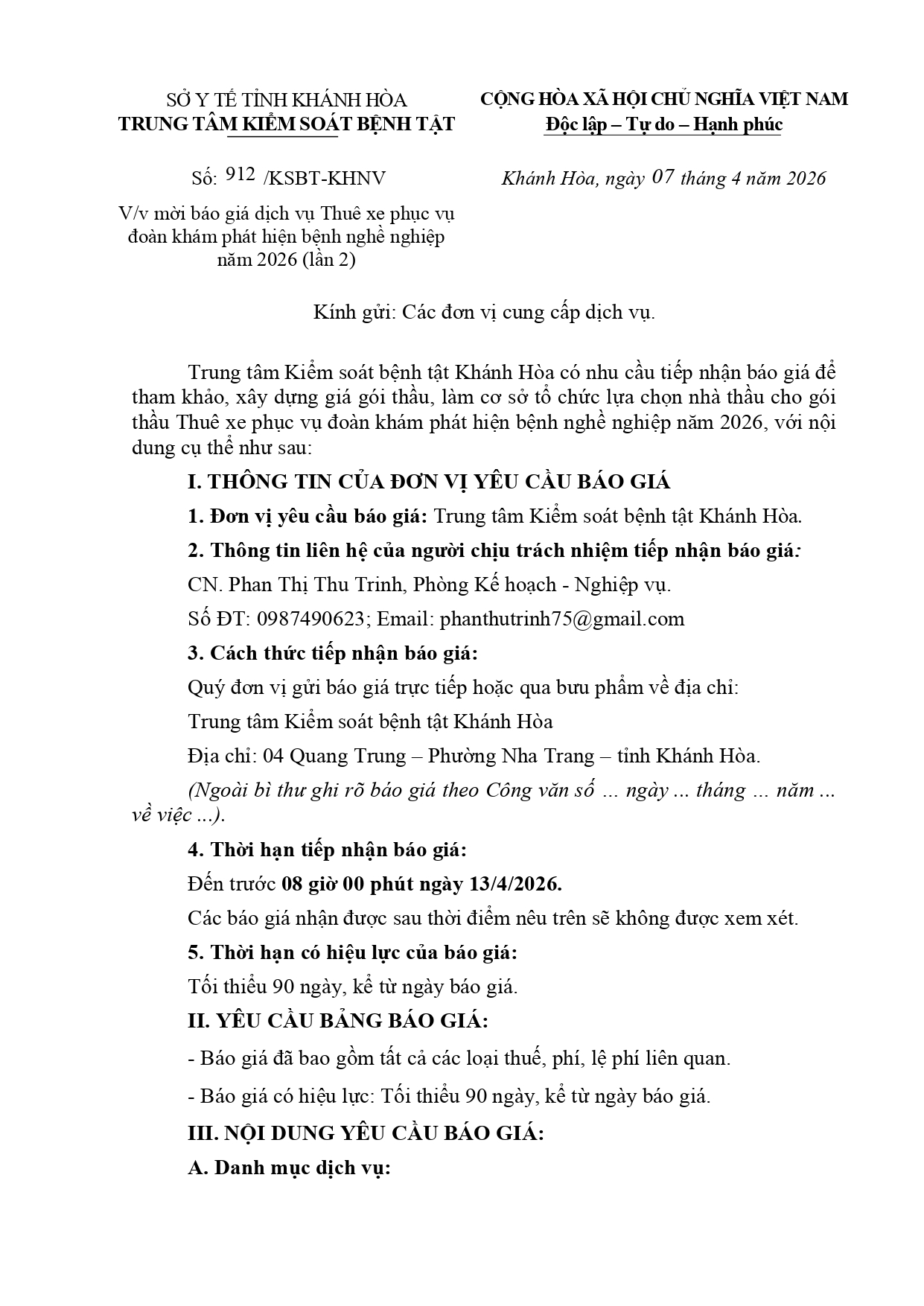 V/v mời chào giá thuê xe vận chuyển viên chức, người lao động đi công tác các huyện, thị xã, thành phố tỉnh Khánh Hòa