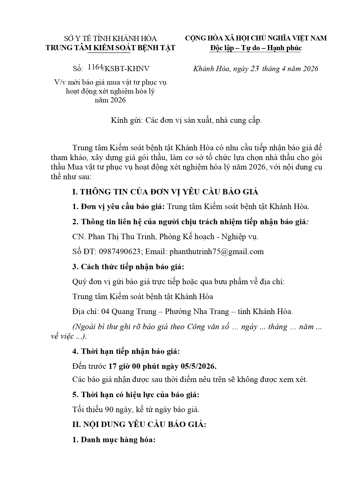 V/v mời báo giá dịch vụ Tuyên truyền hưởng ứng Ngày sức khỏe toàn dân Việt Nam (07/4) năm 2026