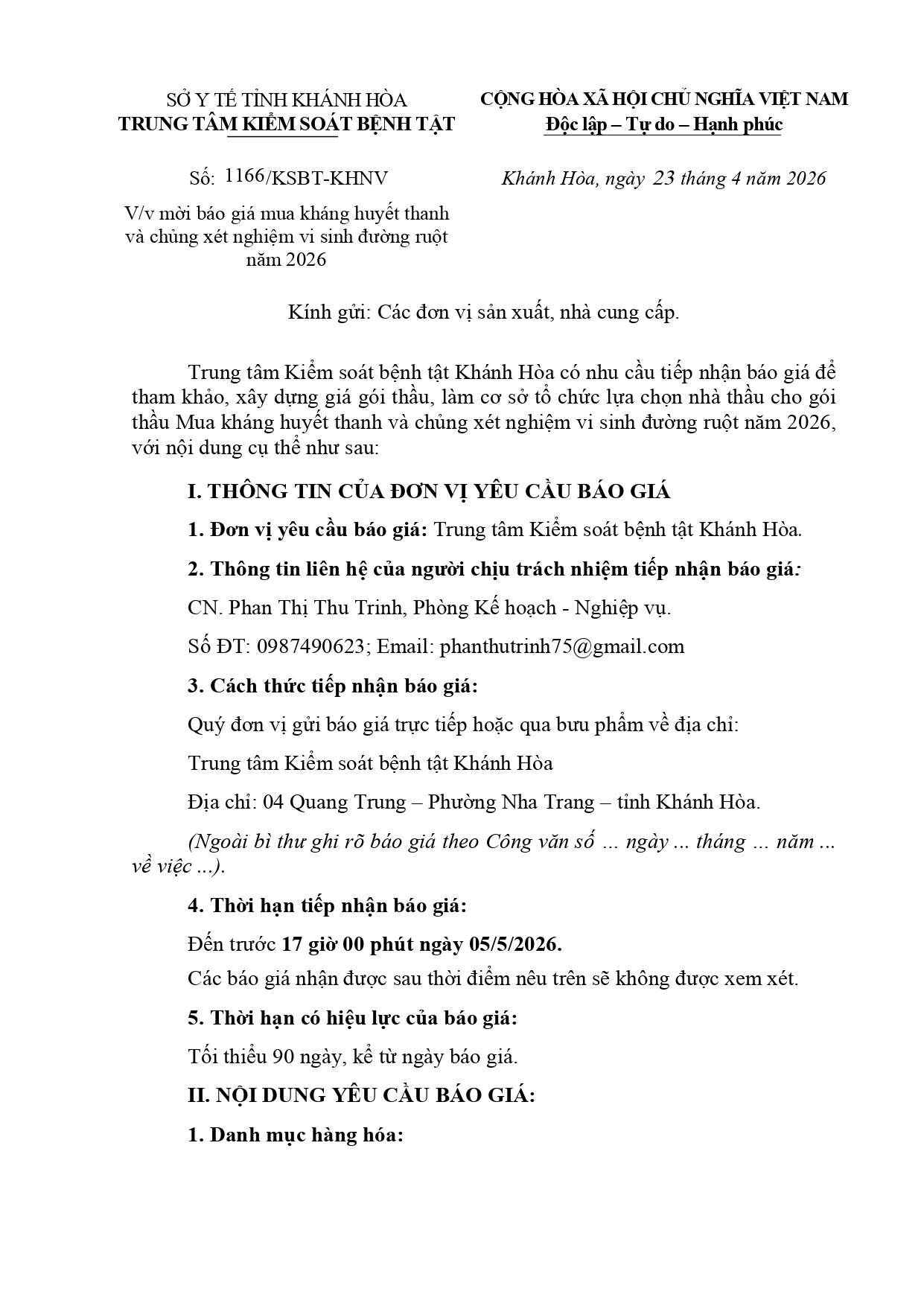 V/v mời báo giá dịch vụ Tuyên truyền hưởng ứng Ngày sức khỏe toàn dân Việt Nam (07/4) năm 2026
