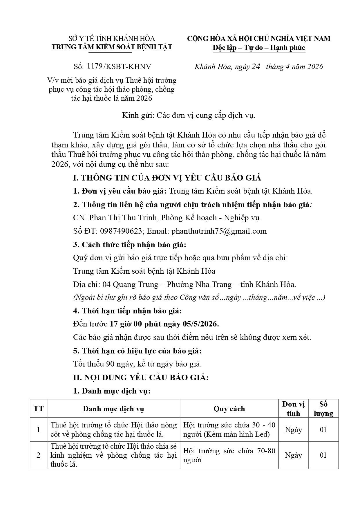 V/v mời báo giá dịch vụ Tuyên truyền hưởng ứng Ngày sức khỏe toàn dân Việt Nam (07/4) năm 2026