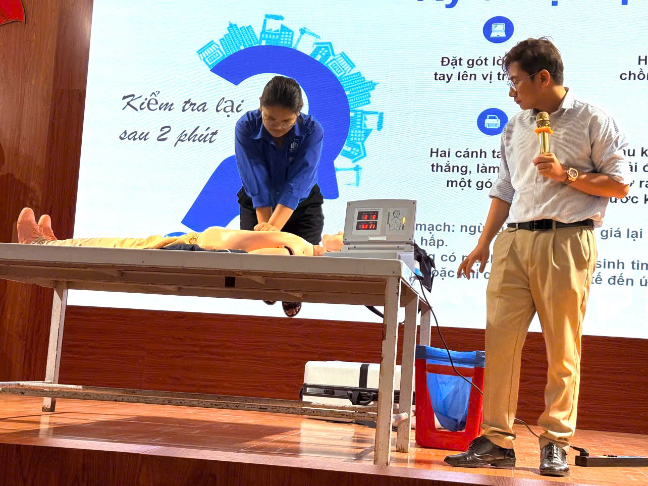 Một trong những nội dung trọng tâm của chương trình là phần hướng dẫn thực hành kỹ năng sơ cấp cứu ban đầu. Sinh viên được trực tiếp tiếp cận các thao tác xử lý tình huống khẩn cấp, từ đó nâng cao khả năng ứng phó khi xảy ra tai nạn, góp phần hạn chế hậu quả và bảo vệ an toàn cho bản thân cũng như những người xung quanh.