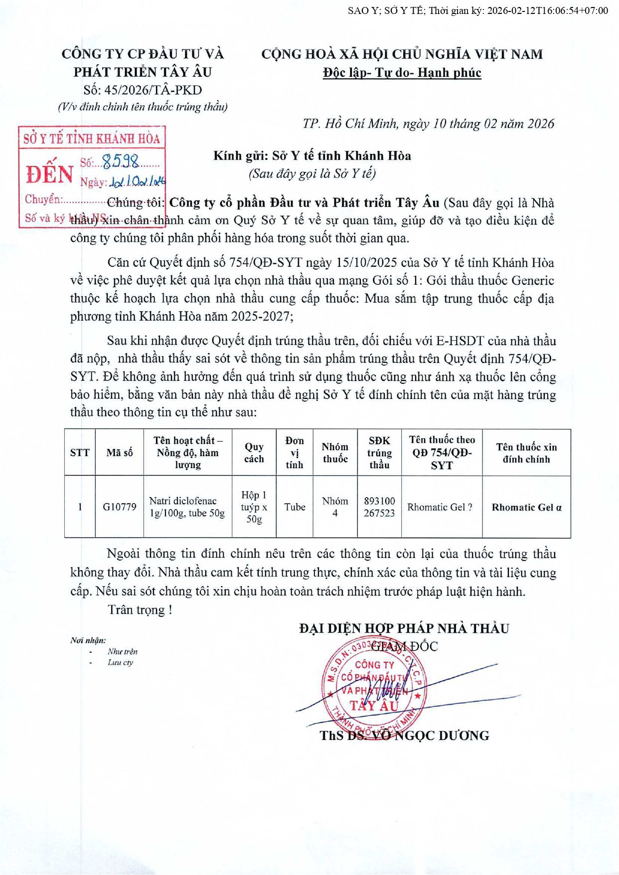 Quyết định Về việc điều chỉnh một số nội dung của Quyết định số 754/QĐ-SYT ngày 15/10/2025 của Sở Y tế về việc phê duyệt kết quả lựa chọn nhà thầu qua mạng gói số 1: Gói thầu thuốc Generic thuộc kế hoạch lựa chọn nhà thầu cung cấp thuốc: Mua sắm tập trung thuốc cấp địa phương tỉnh Khánh Hòa năm 2025-2027 (lần 2)